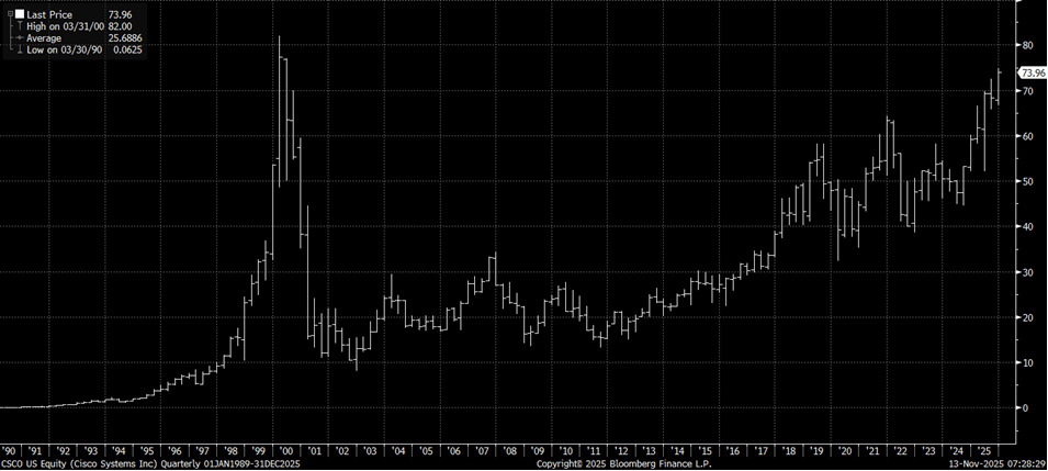 CSCO – Remember when you paid 40x revenue for CSCO in 2000? Well, you’re about to get to break even finally (PLTR is currently 100x).