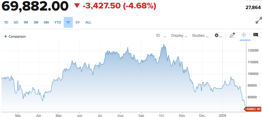 Cryptocurrency-linked stocks (MSTR -7%, COIN -5.2%) are falling, extending losses, after Bitcoin slumped to the lowest price since November 2024.