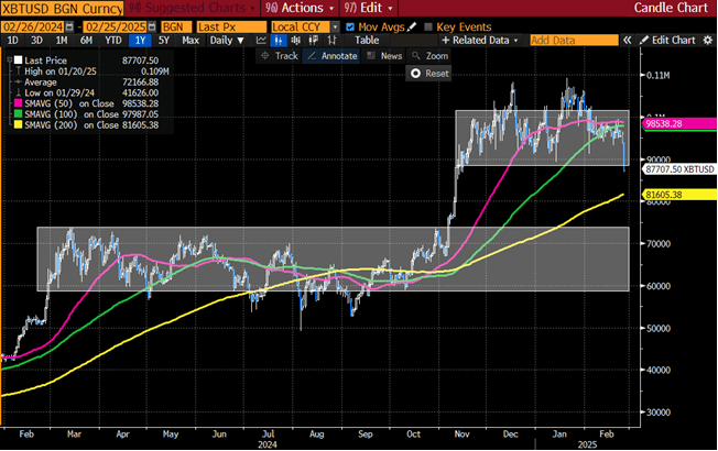 CRYPTO Carange: Bitcoin now ~20% off highs seen last month; coincides with fading retail bid / sentiment; ETH weekly chart shows we are just below the 200 weekly moving average, hitting some sort of longer-term trend