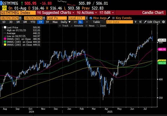 Megacaps hit frsh highs Thurs am before fading hard; ~5% off those highs seen Thur as AWS whiff pressured AMZN while lack of AI narrative kept lid on Apple