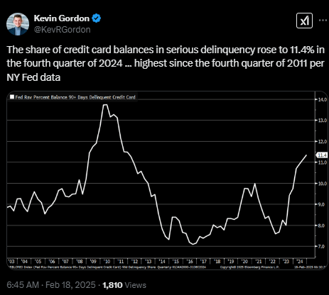 Not an issue yet, but credit card delinquencies highest since Q4 2011
